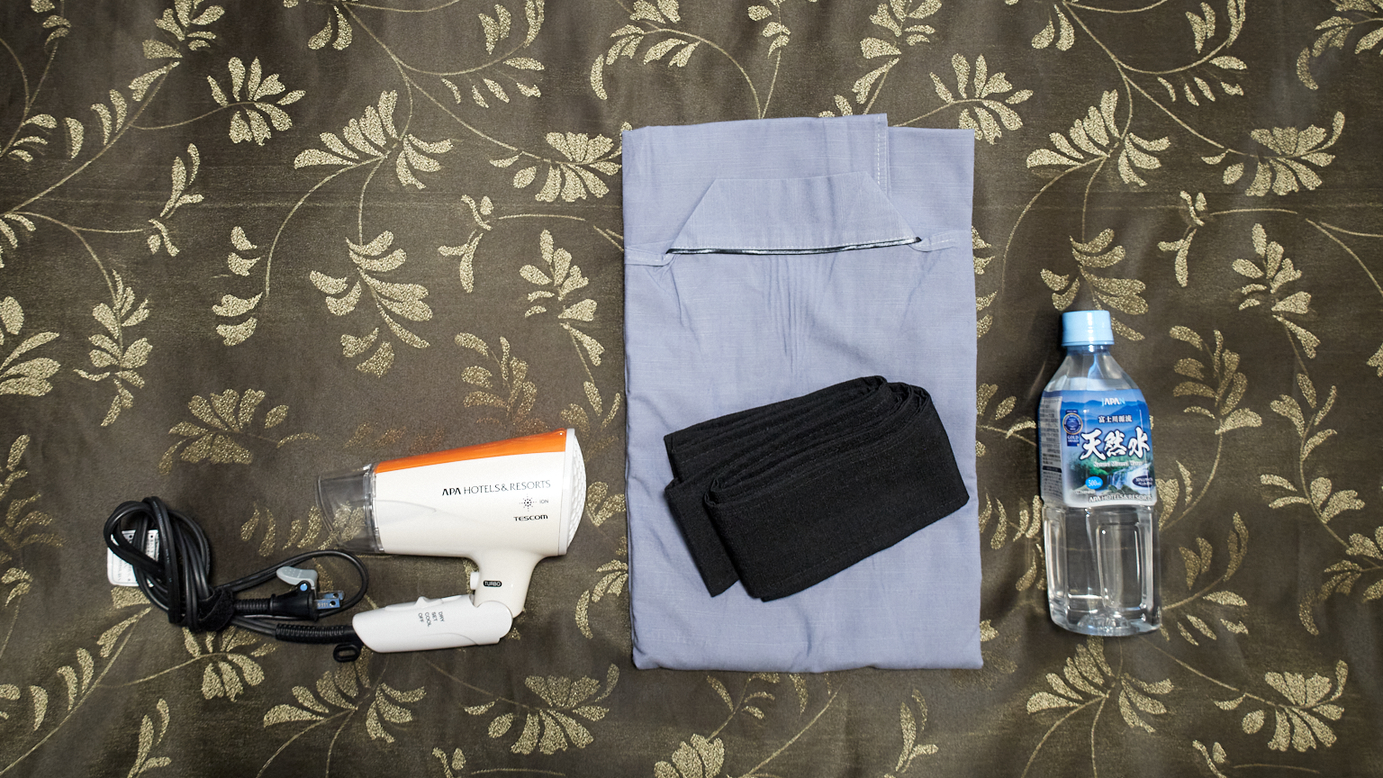 館内着は浴衣(内側が紐で結べるタイプ)、帯と半纏はんてんが用意されています。もちろん、浴衣のまま大浴場利用も可。浴衣が苦手な方はパジャマや部屋着を持参しても良いかもです。(私はTシャツとリラコ持参😛)他には使い捨てスリッパが無料で置かれている点もポイント高かったです。
