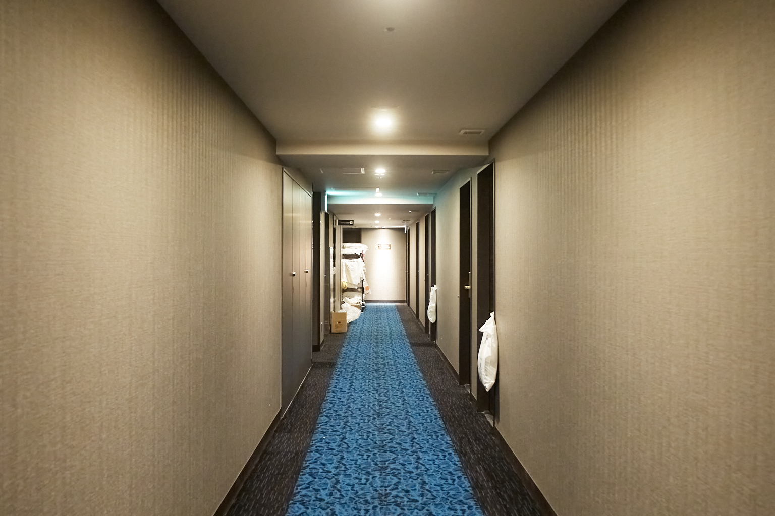 廊下に出るとこんな感じで、体感ではもっと暗かった…。チェックイン時刻過ぎてもだいぶ清掃が続いていたけど、細かいことは気にしない😊