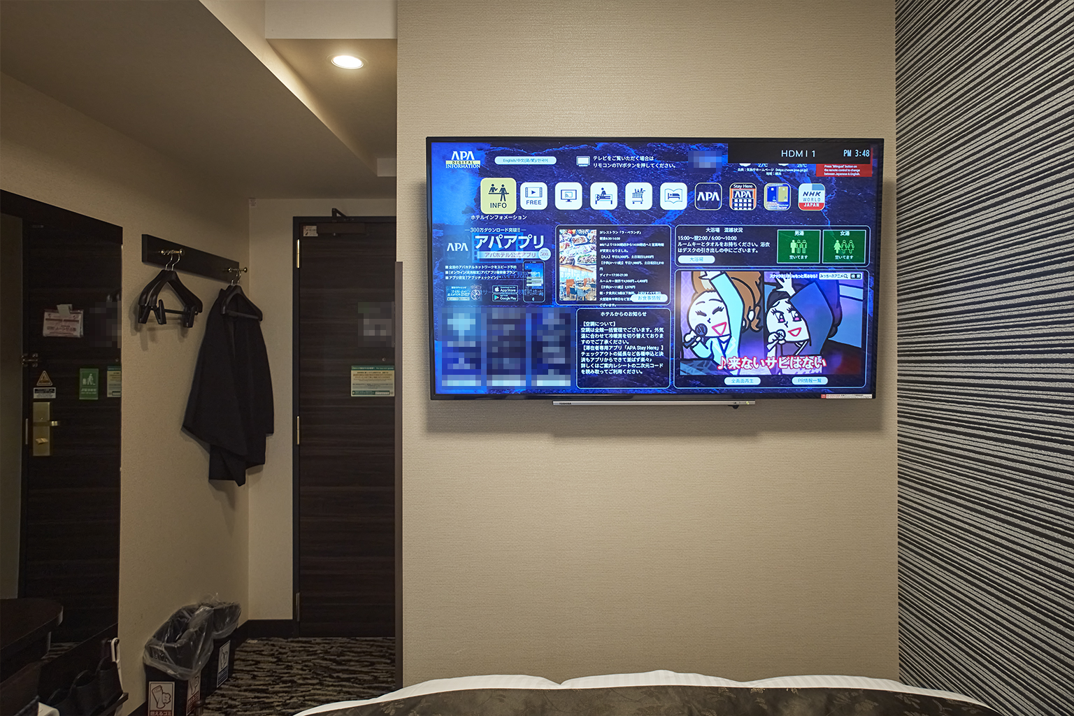大浴場の混雑状況も確認できたり、いろいろ必要な情報が詰まっているテレビ画面。奥にかかっているのが、館内着の半纏(はんてん)。