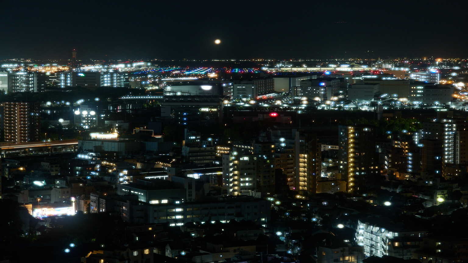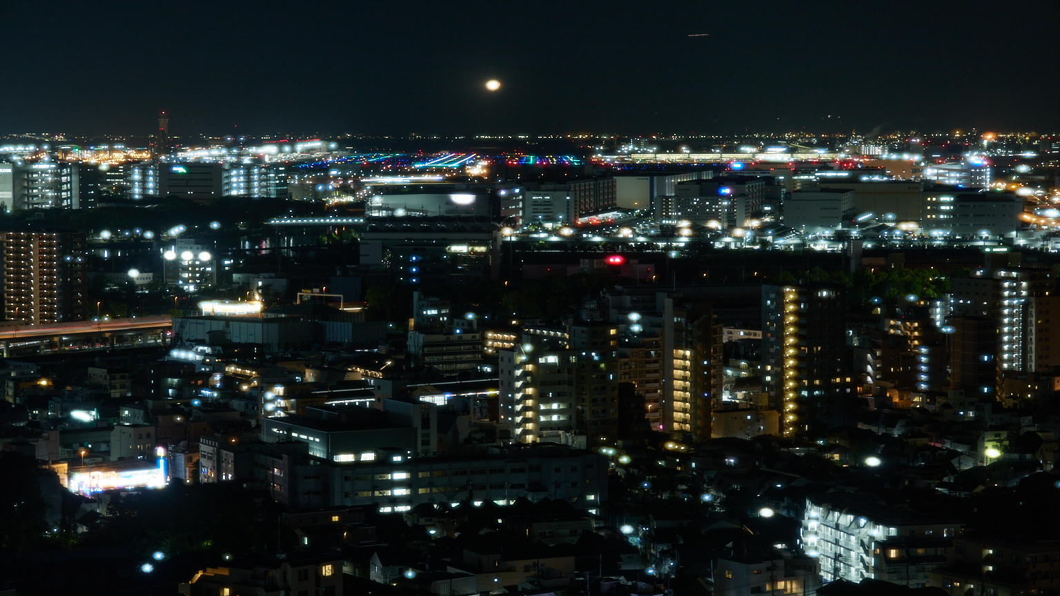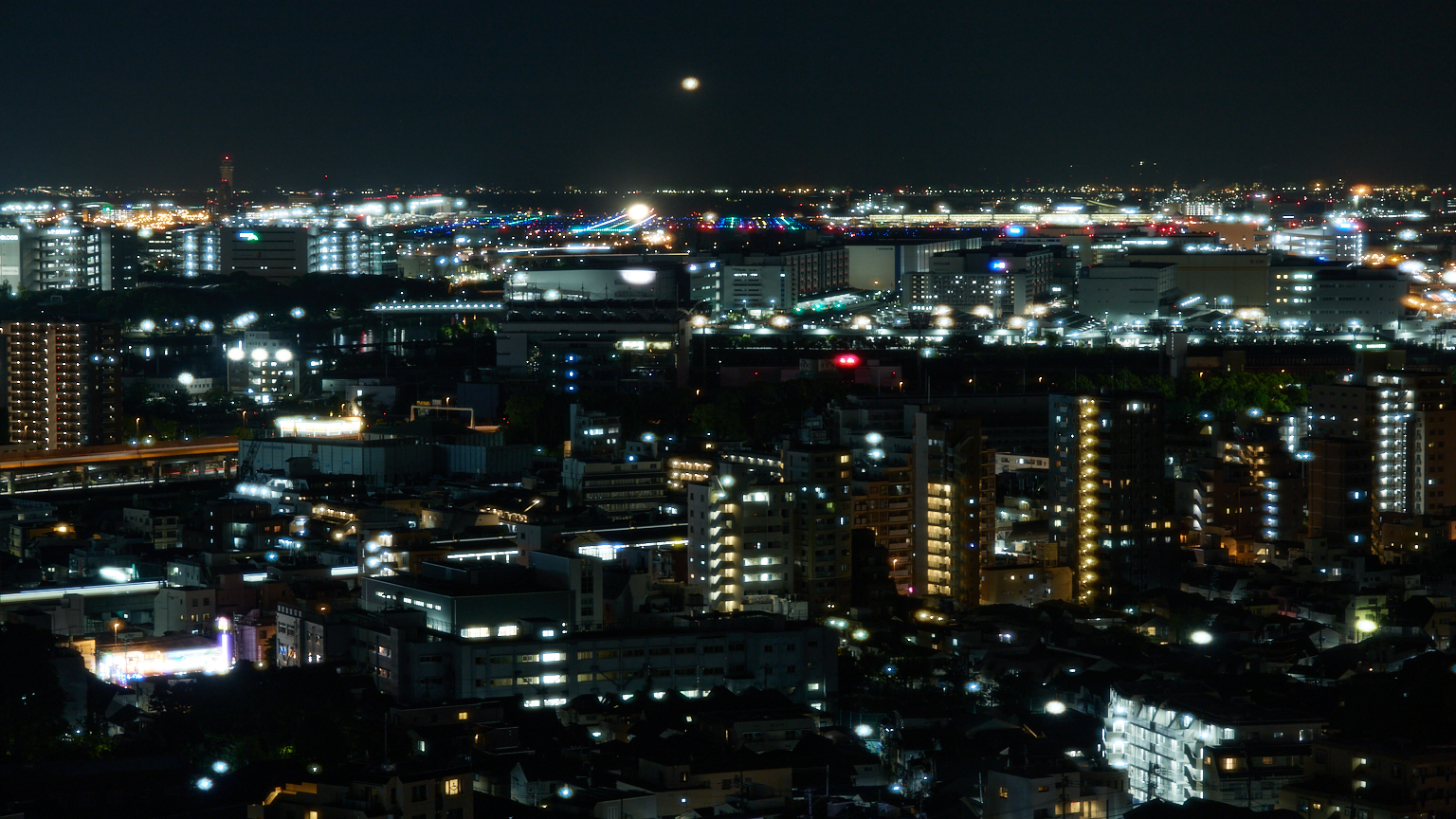 写真奥のきらきらカラフルな照明は滑走路のライトです