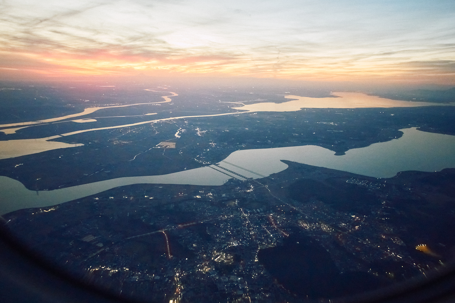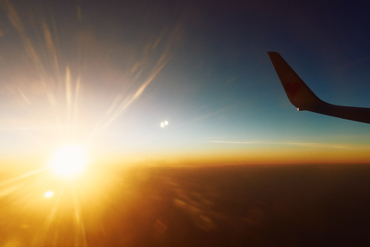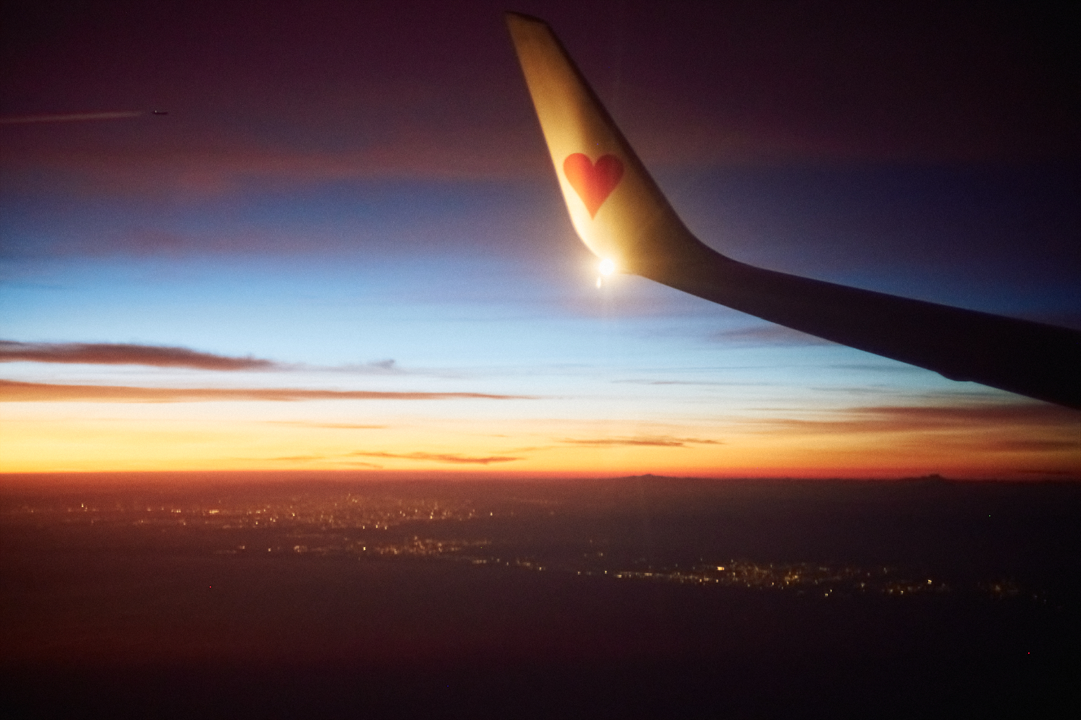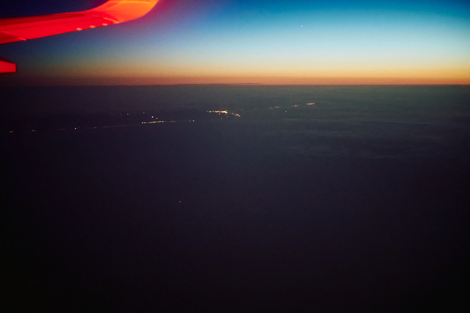 高く上昇した機内からは、見える世界がぐっと広がり、地上ではすでに太陽が沈んでいても、上空にはまだ光が残っていて、夕焼けが続いている…、なんてこともよくあります。