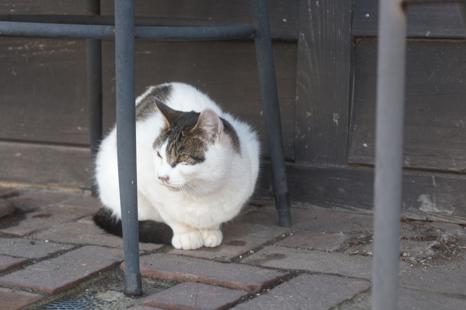 函館山に向かう途中で出会った、にゃんこちゃん。横目でしっかり見ています😼 函館の猫ちゃんはモフモフに防寒対策してます。