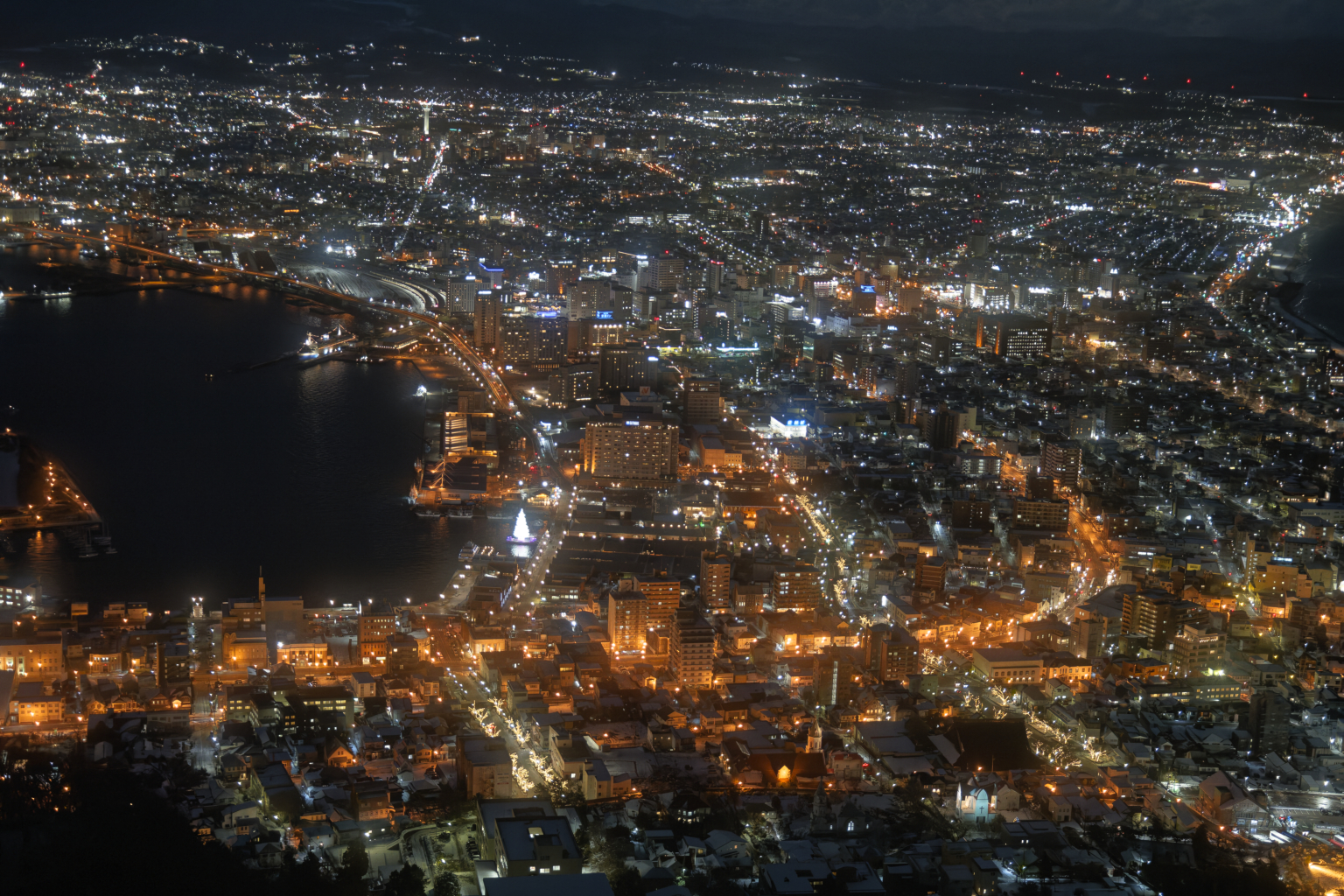 クリスマスツリーのあたりが赤レンガ倉庫、奥のほうに五稜郭も見えるよ。