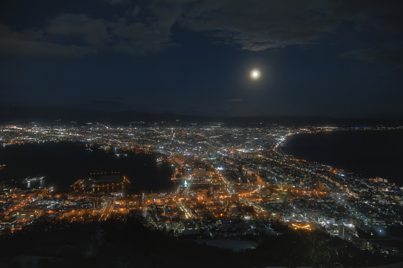 この日は満月、空には雲もなく、冬らしい空気が澄んだ夜でした。さらに、街の灯りの中に赤レンガ倉庫のクリスマスツリーまで見渡せて、これ以上を望むのは贅沢かもしれないと思えるほどのコンディション。