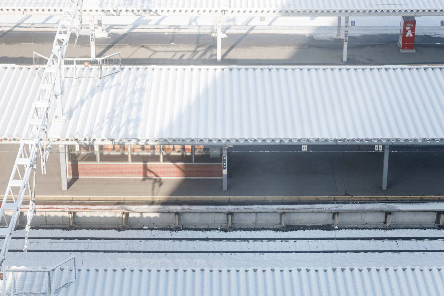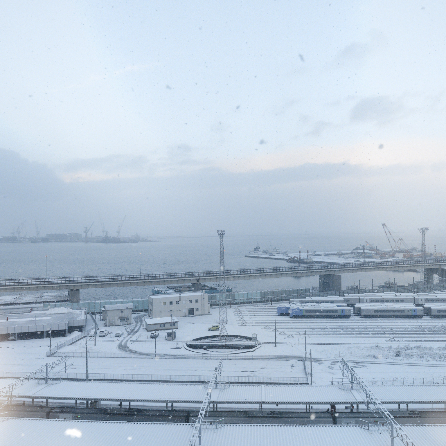 トレインビュー自体は駅前ホテルでは珍しくないかもしれません。それでも今回は、鉄道そのものよりも、雪景色や海の淡い色合いと重なったことで、函館らしい特別感が生まれたように感じました。