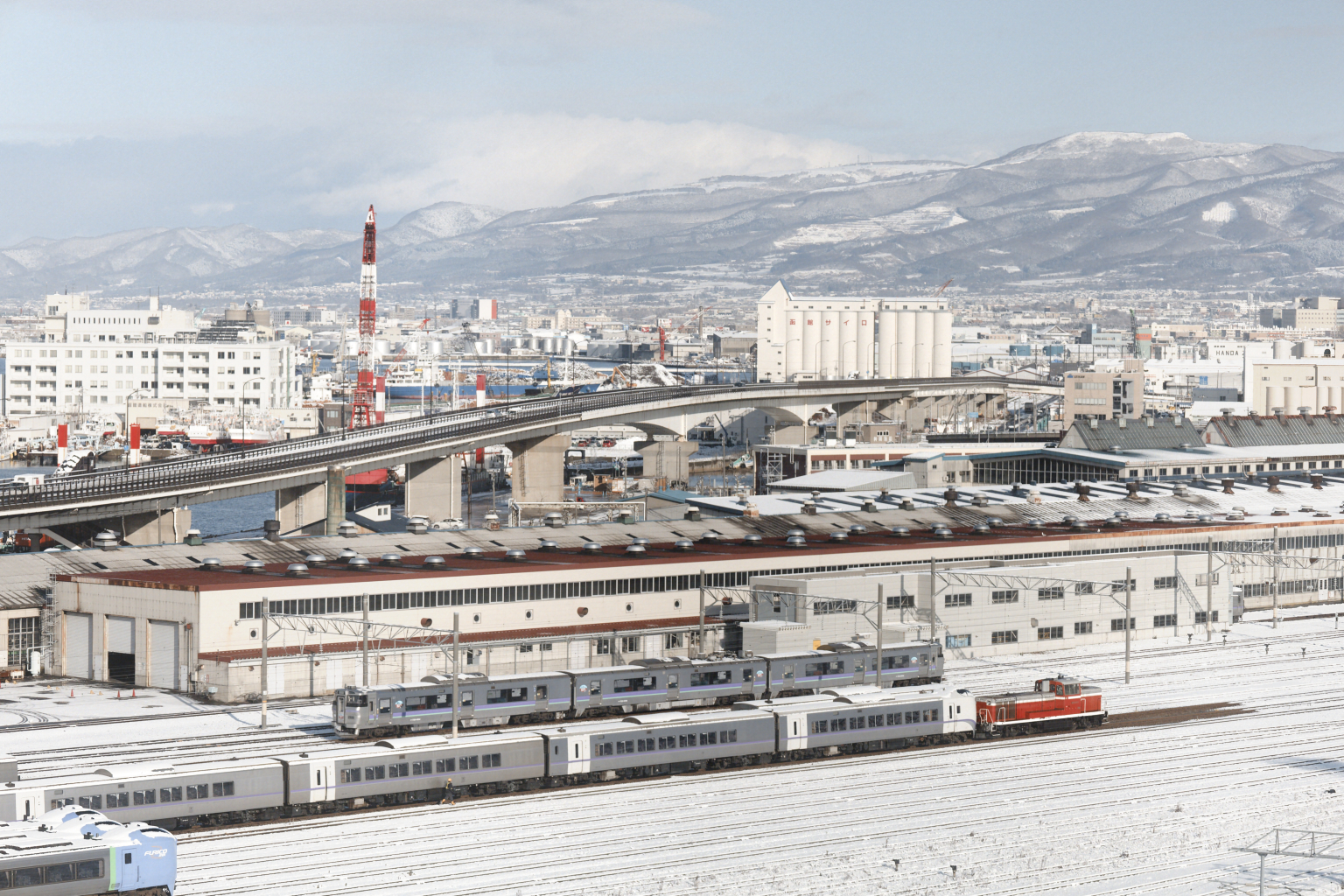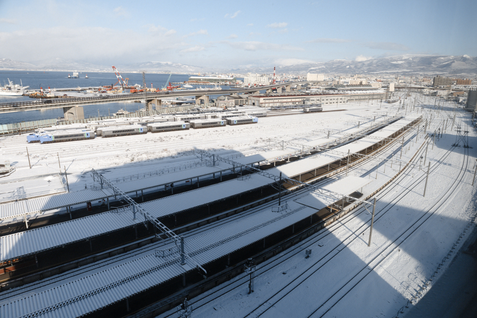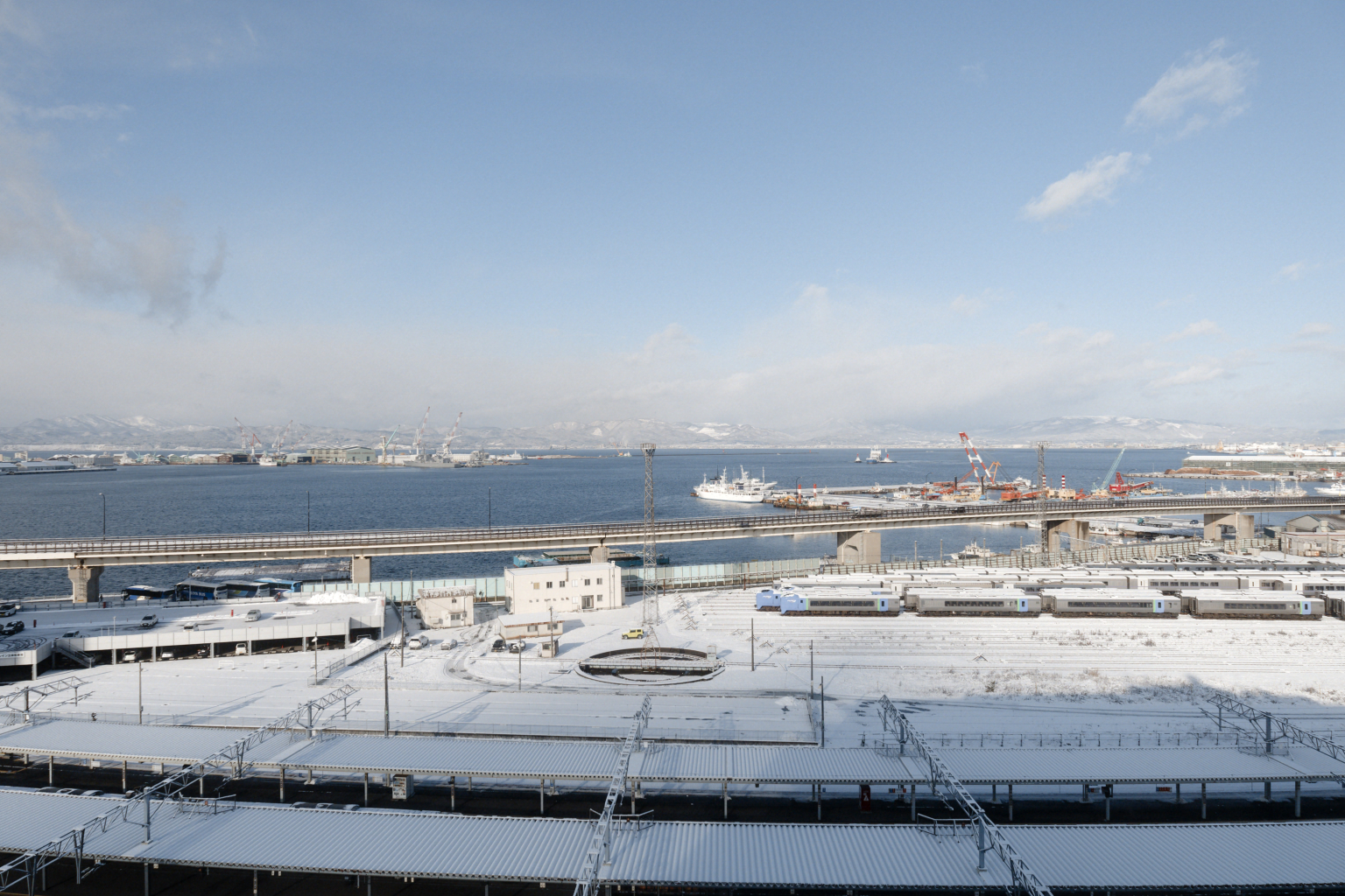 目の前には函館駅の線路や電車が見え、遠くには海や船も臨めます。街が静かに一日を始める様子を、少し離れたところから眺めているような、不思議と落ち着く光景でした。