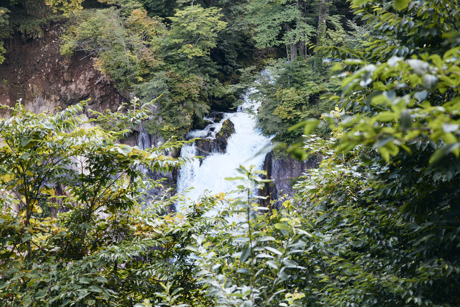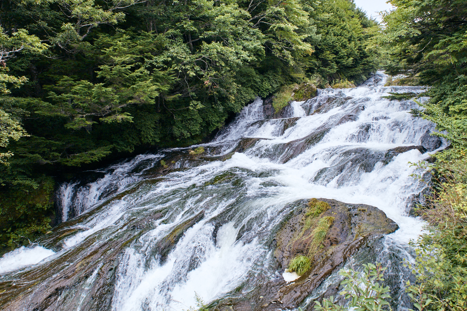 湯ノ湖の水が岩の斜面をすべるように落ちる滝で、落差は約70m。観瀑台が滝のすぐ近くにあり、迫力ある水しぶきを間近で体感できます。周辺はハイキングコースにもなっていて、森林浴をしながら歩くのもおすすめ。近くには軽食が買える売店もあります。