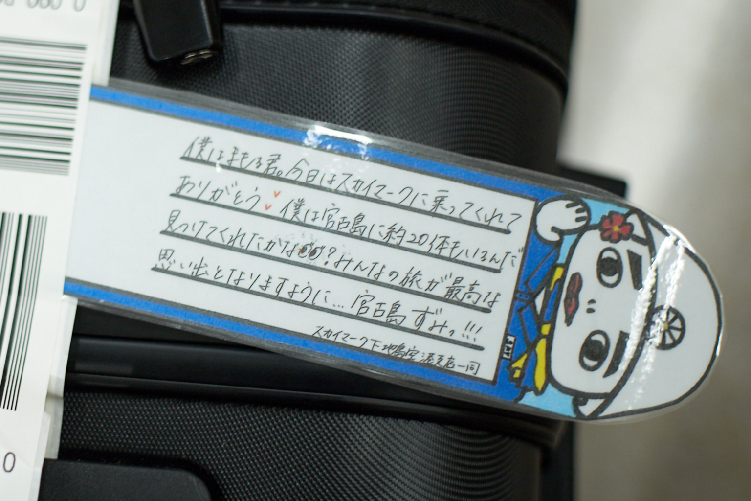 空港スタッフの方がスーツケースにつけるクレームタグ(行き先やバーコードが印刷されたシールタグ)と一緒に〝まもるくん〟のオリジナルタグもつけてくれました。タグには「スカイマーク下地島空港支店一同」様からのメッセージも添えられていて、飛行機好きの私は大感激…!!!!
